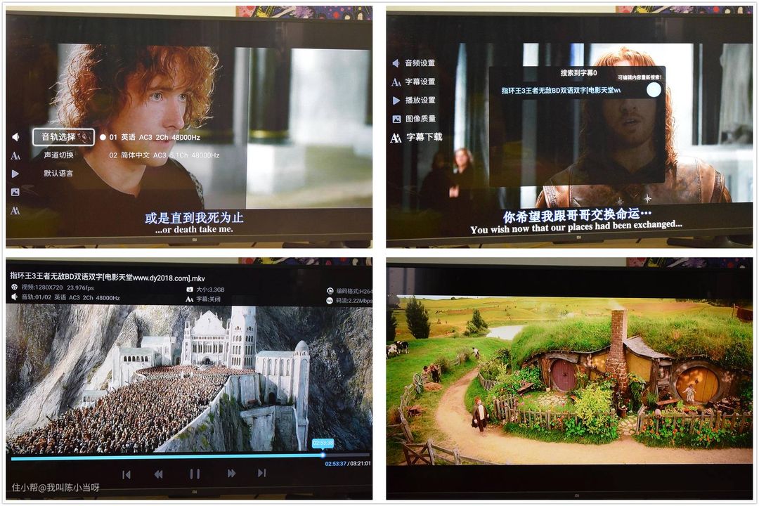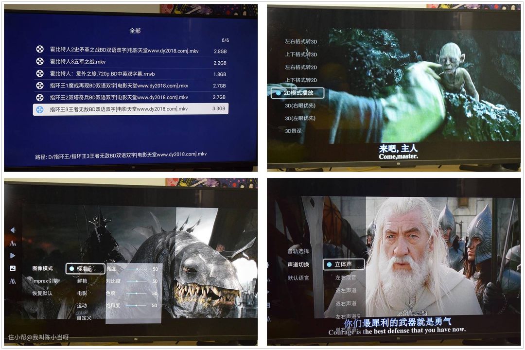 连上硬盘看看电影感受下,我比较喜欢的指环王系列(王者无敌也是醉了)。海美迪这个电视盒子还具有在线搜索字幕的功能,不过可能是我电影没改名字的原因,没搜到字幕。播放电影时有很多设置,在观看电影的时候可以根据个人喜好来设置电影效果。海美迪H7 Plus拥有HDR10高动态视频解码技术,10bit色深显示,同时拥有BT.2000的色彩空间技术,让电视机色彩显示更丰富,更细腻,色彩过渡非常自然,没有噪点和锯齿。海美迪H7 Plus搭载了蓝牙协议4.2的连接功能,如果连上蓝牙音箱,观影效果会更佳。