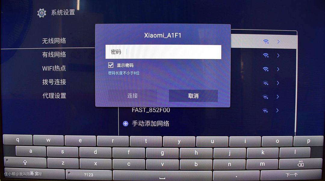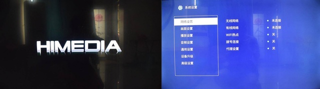 开机开电视,开机界面的HIMEDIA有种大片的感觉,此处没有加载广告,赞一个。按照提示一步步进行连上网络。输入密码的时候数字直接按遥控器键盘,这个比较方便,输入字母的时候得用到遥控器中间的圆形选择。