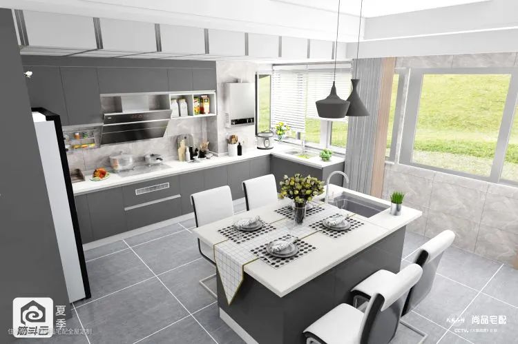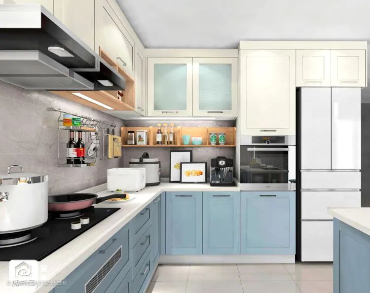 ▲ 灰色相对比较容易搭配,橱柜选择莫兰迪蓝,整体看上去非常和谐。