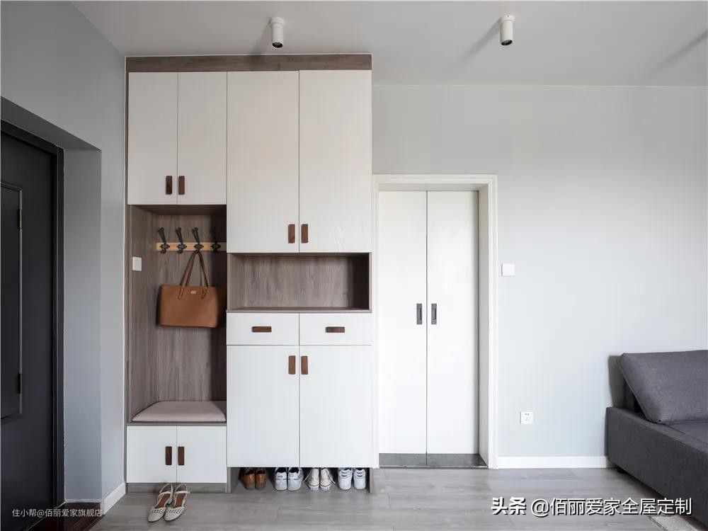 换鞋凳+鞋柜+衣柜的组合设计,满足屋主回家坐着换鞋、收纳鞋以及外套的多样功能。换鞋凳靠墙背板安装挂钩,包包随手挂在上面很是方便。