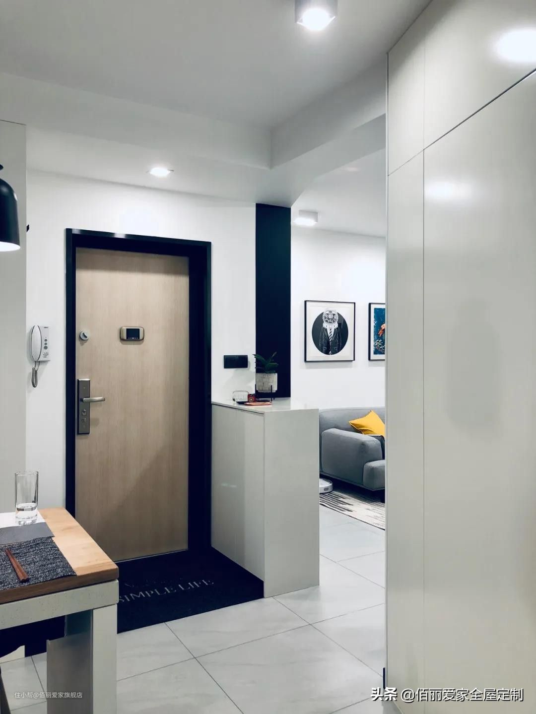与大门垂直的鞋柜,再打开门的一刻就方便直接将包包钥匙随手放在留空的柜子上。