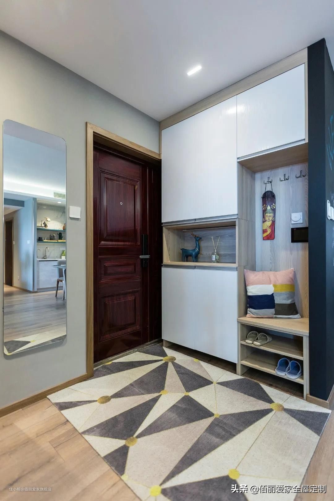 大部分人出门前喜欢整理容貌,在换鞋凳背板安装穿衣镜,充分利用空间为自己所用。