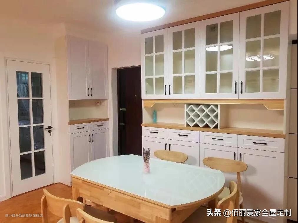进门就是客餐厅,将一面长长的墙面都利用起来定制储物柜,玄关鞋柜与餐边柜或者电视柜结合,室内更加整洁大方哦。