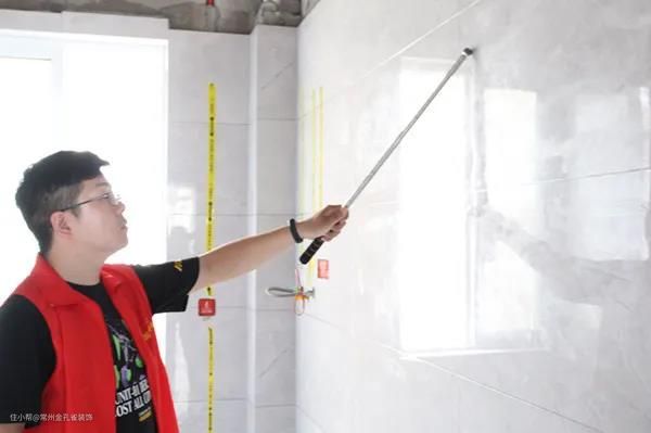 使用空鼓锤敲打瓷砖表面,辨别瓷砖空鼓率,单片砖需要控制在15%内,一面墙需要控制在5%以内。