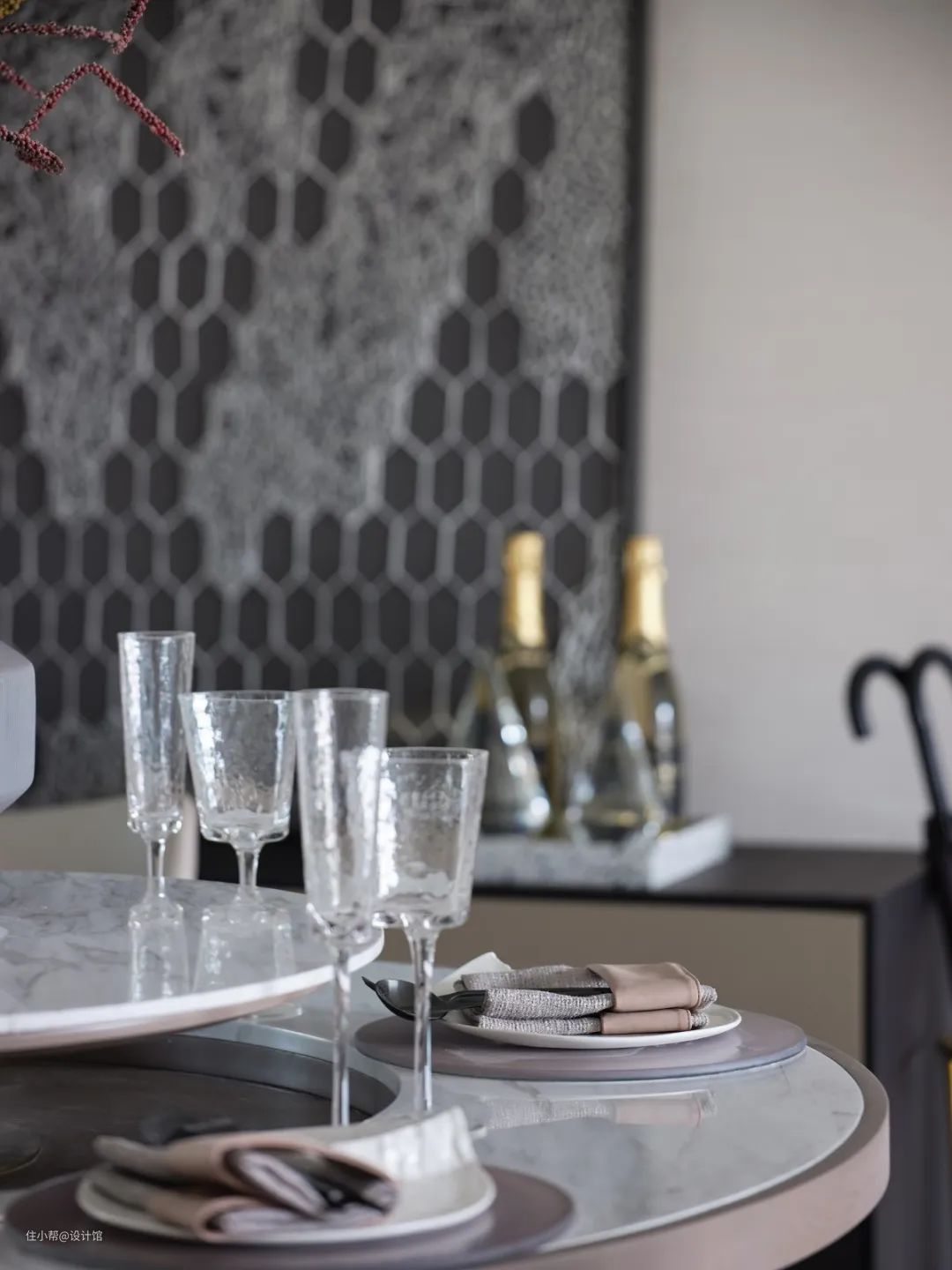 ▲圆形的餐桌,中间带了一个圆形的升降转盘,布置镜子的餐具与花瓶,使得空间充满优雅的情趣感。