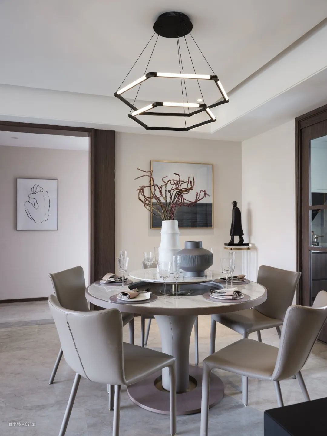 ▲餐厅布置卡其色的餐桌椅,大理石与布艺结合的搭配,顶上一盏双重六边形的吊灯。