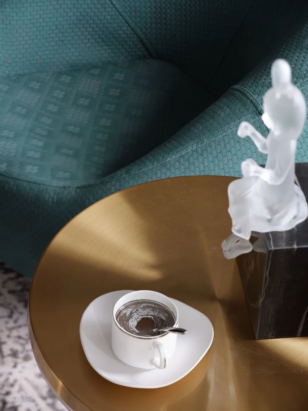 ▲金属质感的边几,布置咖啡与装饰品,与青色的布艺椅相呼应,带来的是精致的轻奢生活体验。