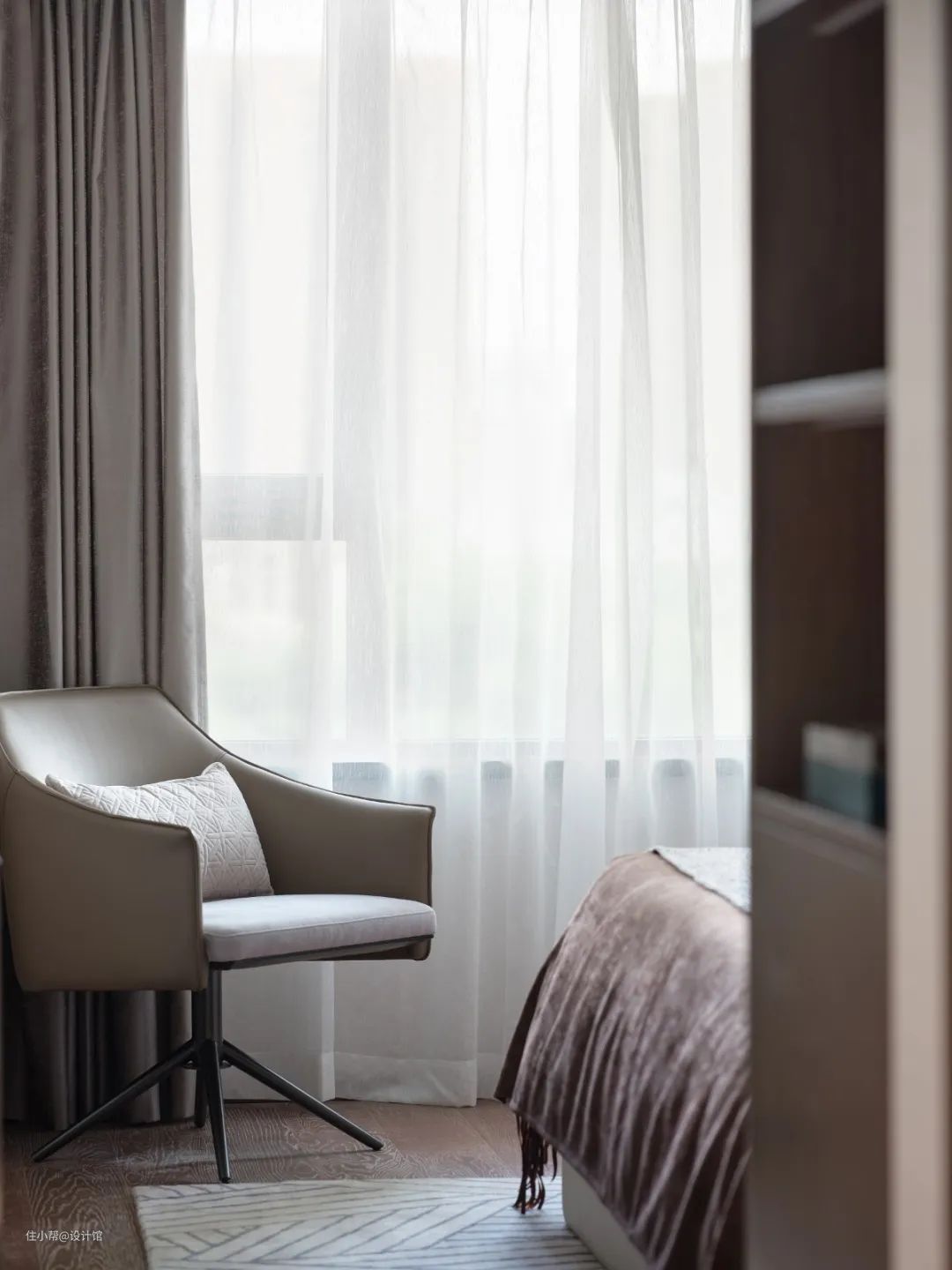 ▲卧室在中性色调的空间基础,床头墙以硬包为背景,布置舒适的皮质床,地上还布置了一席地毯,整个空间给人以现代优雅的自然体验。