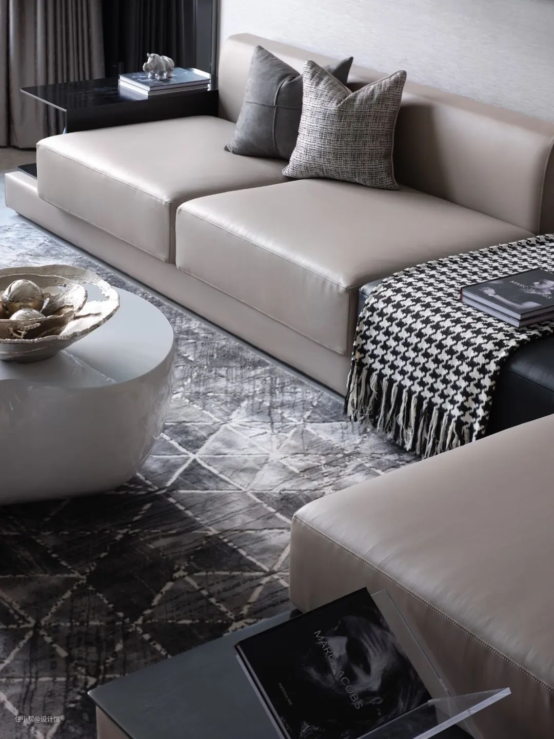 ▲灰色三角图案纹理的地毯,布置卡其色的皮沙发,还有白色的时尚造型茶几,在恬静的空间里,铺叙出一种轻盈的生活环境。