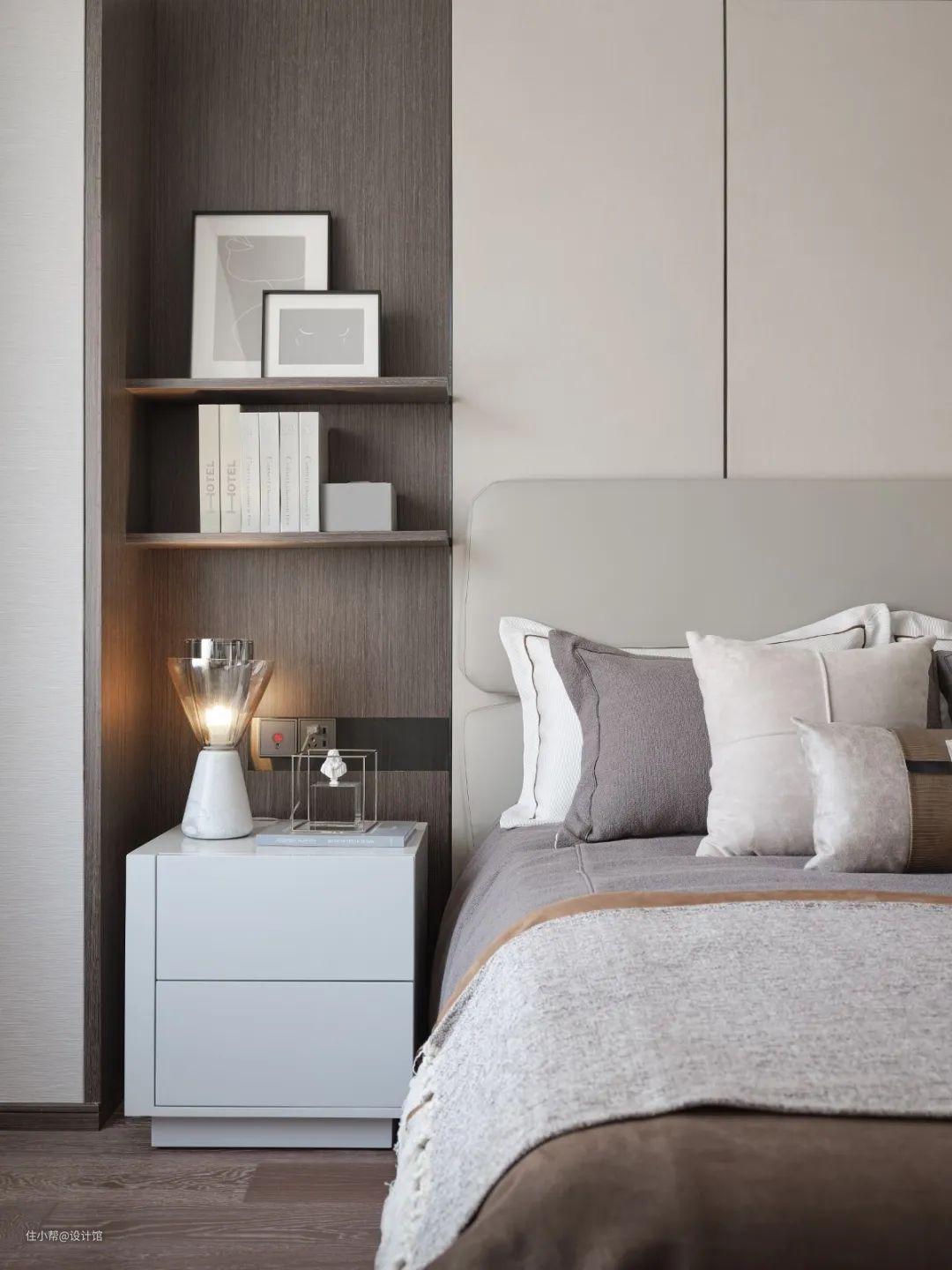▲床头墙位置的墙面以木饰面的背景,装上双层的搁板书架,摆上照片与书籍,使得睡眠氛围更加情趣雅致。