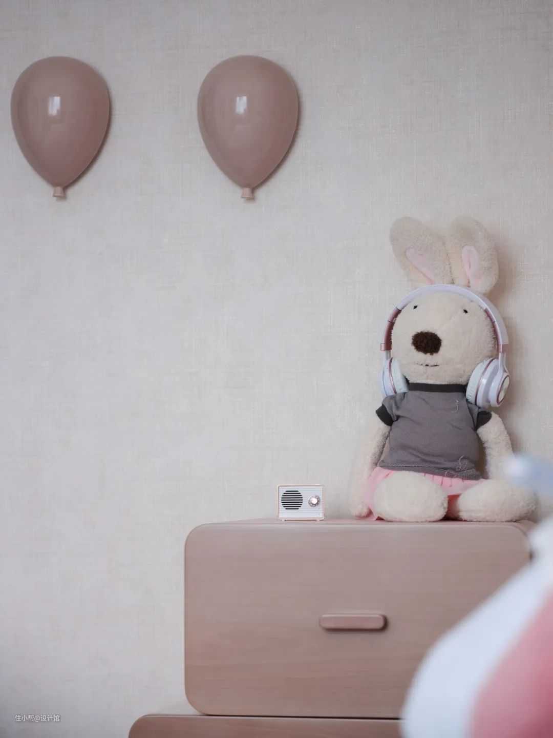 ▲床尾柜上的公仔布置,墙面两个气球造型的壁灯,也增添了空间的童趣与活泼气息。