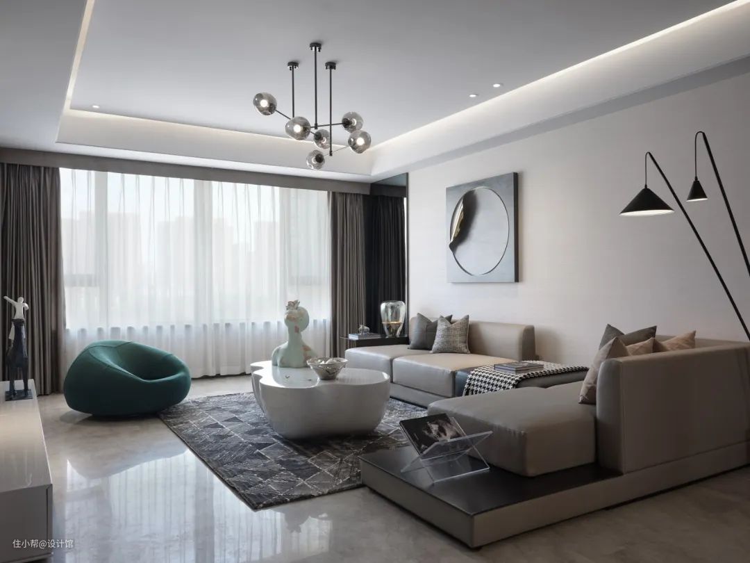 ▲客厅空间以中性色的灰调硬装,布置上现代时尚的家具陈设,搭配上一张独特的轻奢布艺懒人椅,为客厅营造出一种优雅高档的舒适氛围。