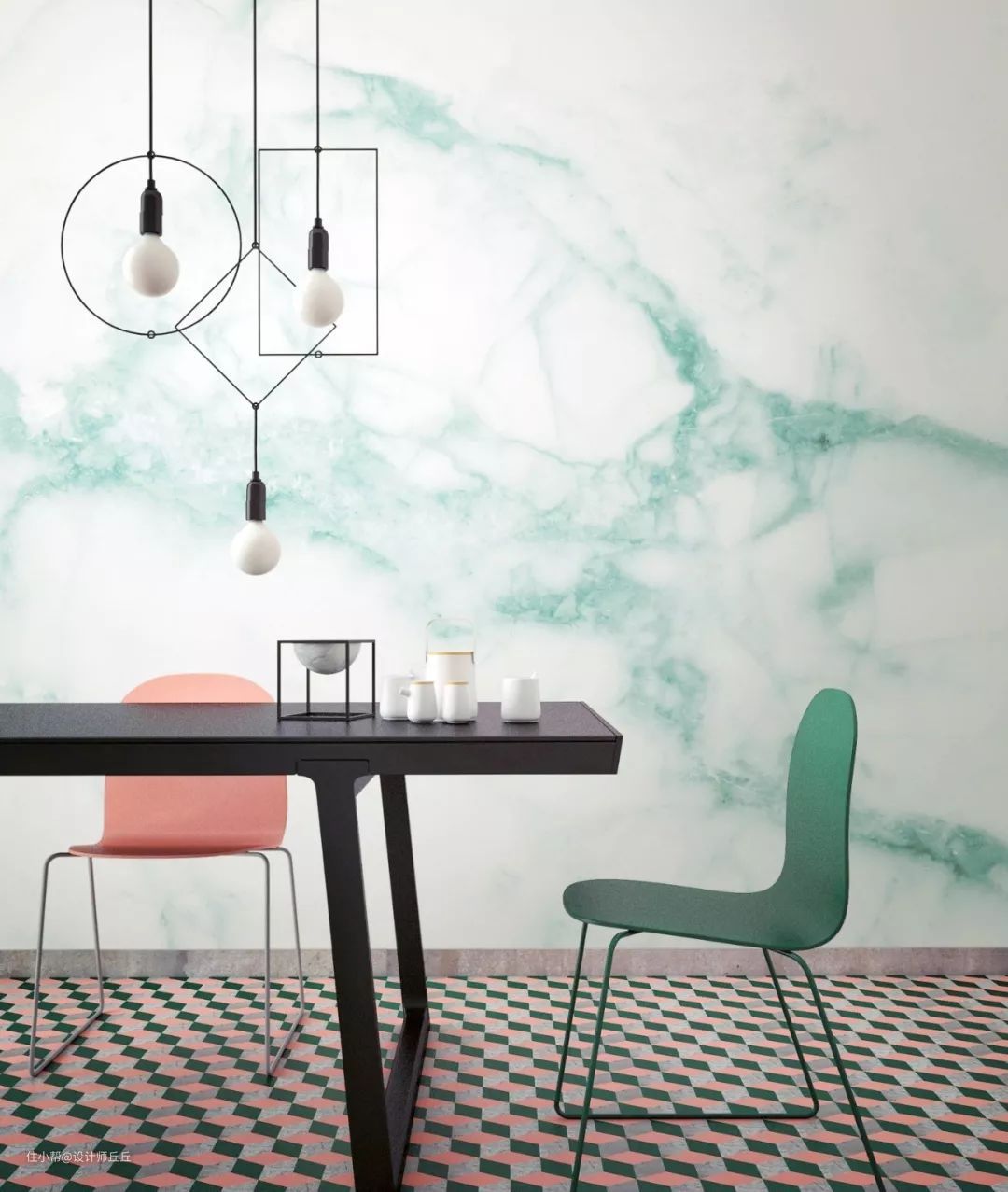 如果怕大面积的绿色不好驾驭,那么青绿色的大里石纹墙面和流行绿植背景墙面,就一定不要错过。白色加上点点绿色,让人耳目一新,搭配同样色系的家具,让家中的质感瞬间爆表。