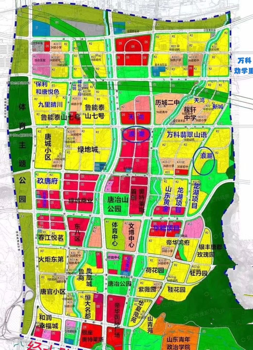 图上标“浪潮”的地方,是浪潮拿地,然后远洋开发的天著春秋,离围子山比较近。