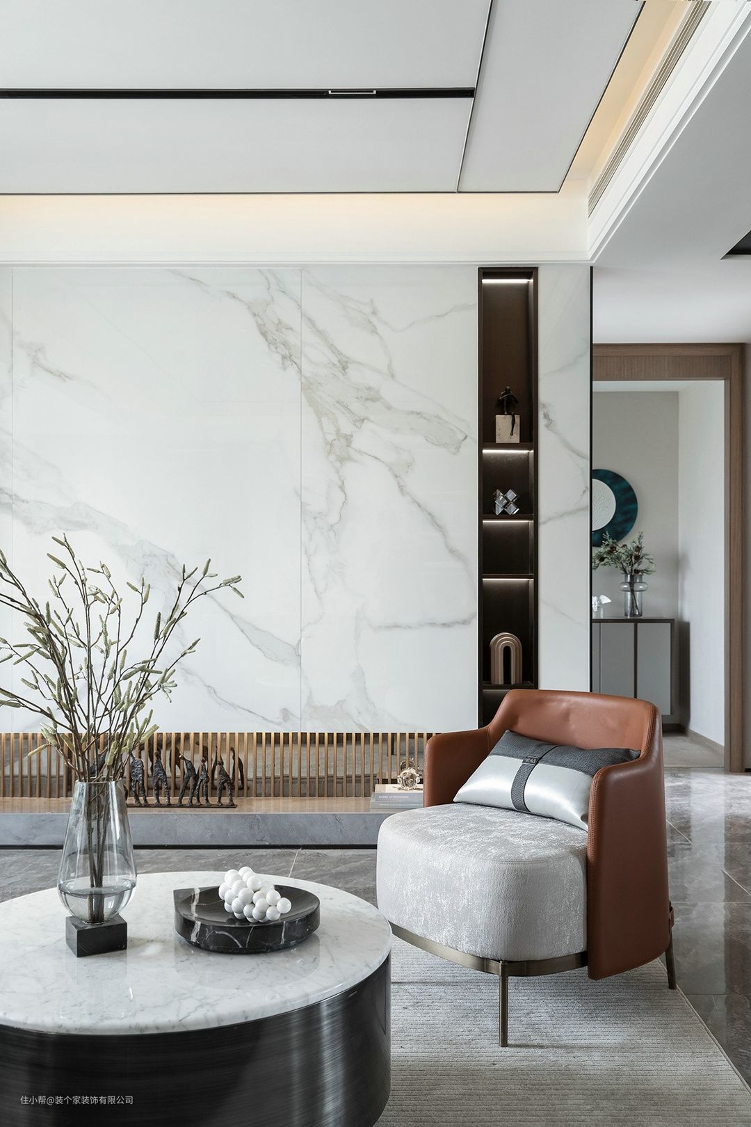 设计师又将其融合在以灰色大理石为底的感光环境中,打破过于寂静的氛围,质感中带着丝丝神秘,提升着空间的轻奢感受。