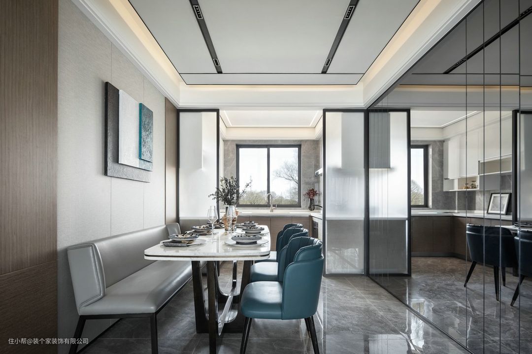 厨房与餐厅不设推门,解决了区域原本布局的狭窄弊端,同时利用镜面反射,增强空间的开阔性,且一虚一实,再造呼应。