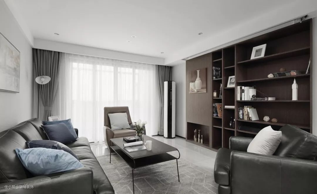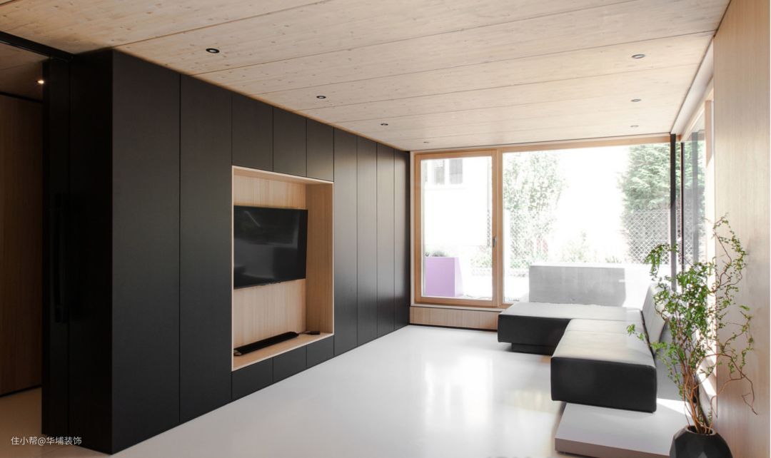 远处看上去只是一面普通的墙面,实际上是满满一墙面的储物空间,同时还可以用移门遮盖电视,打造一个没有电视的客厅。