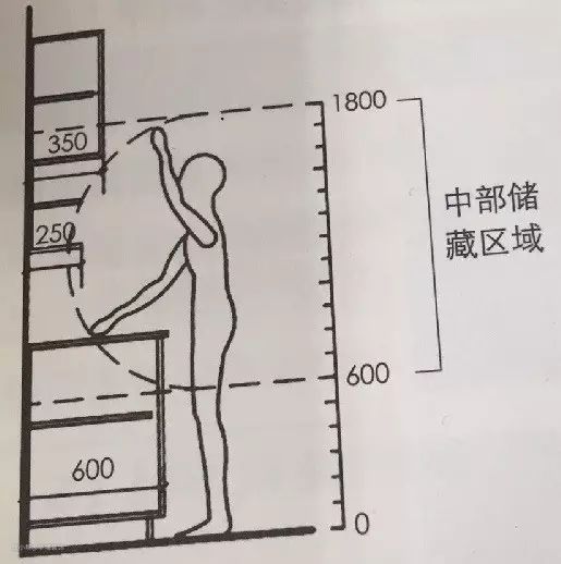 中部局域指距离地面600-1800mm的范围,是以人肩为轴,上肢半径活动的范围,是存取物品最方便,使用频率最高,也是人视线最易看到的区域。