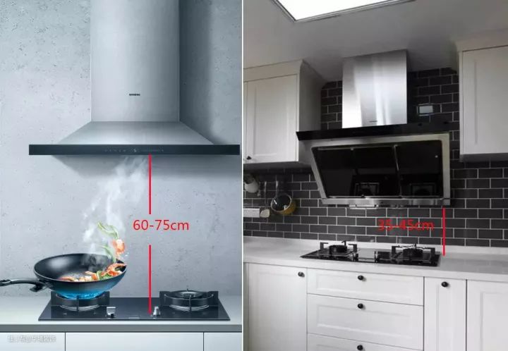 油烟机不管是顶吸式还是侧吸式都可以,根据自己喜欢的来。顶吸式安装高度在距离灶台的65-75cm间;而侧吸式油烟机底部距离灶台距离可以更近,一般在35-45cm间,这是硬指标,不要错过。