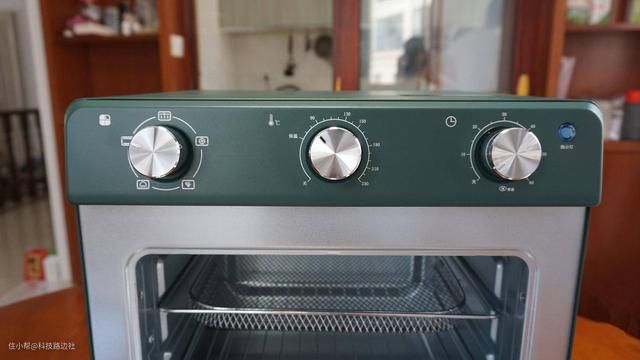 在烤箱的正面是三个控制旋钮,完美还原了复古风的机械旋钮,这三个分别是功能、温度和定时。三个金属质感十足的旋钮,功能清晰一目了然,而且设计在烤箱的上方,也容易控制。
