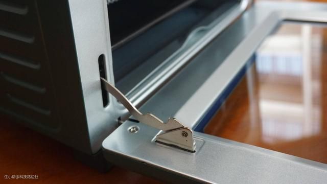 门铰链采用的是单边两节,就是在开合和关闭时,中间有一段是可以停留的,这样方便烤箱后续散热已经刚打开时有个缓冲,以免烫伤。