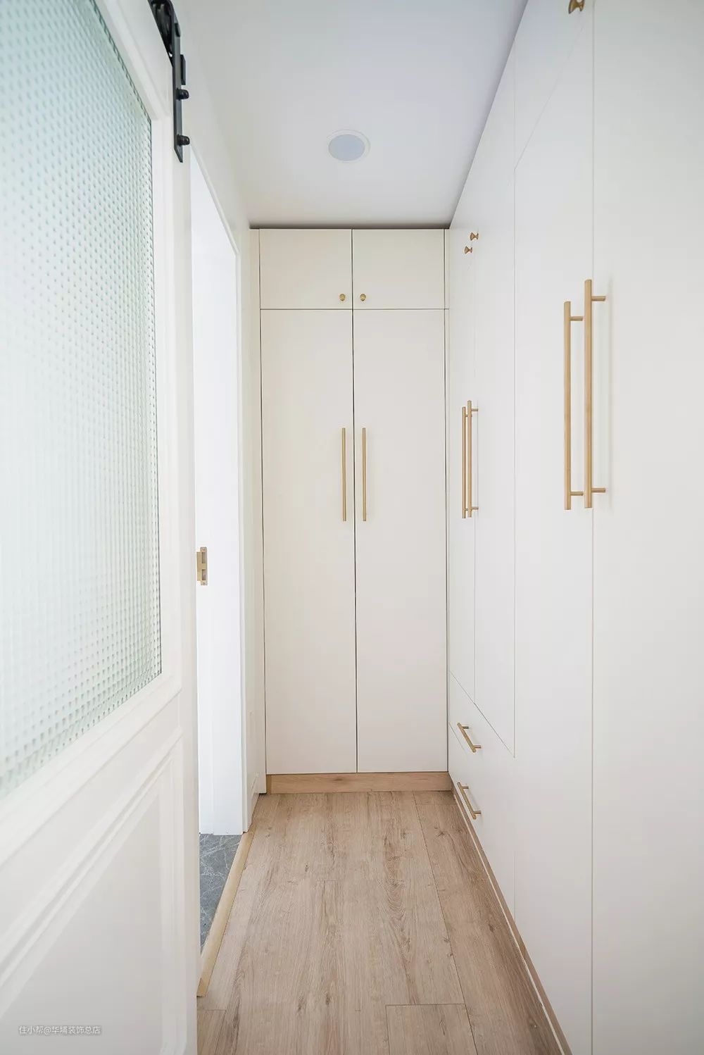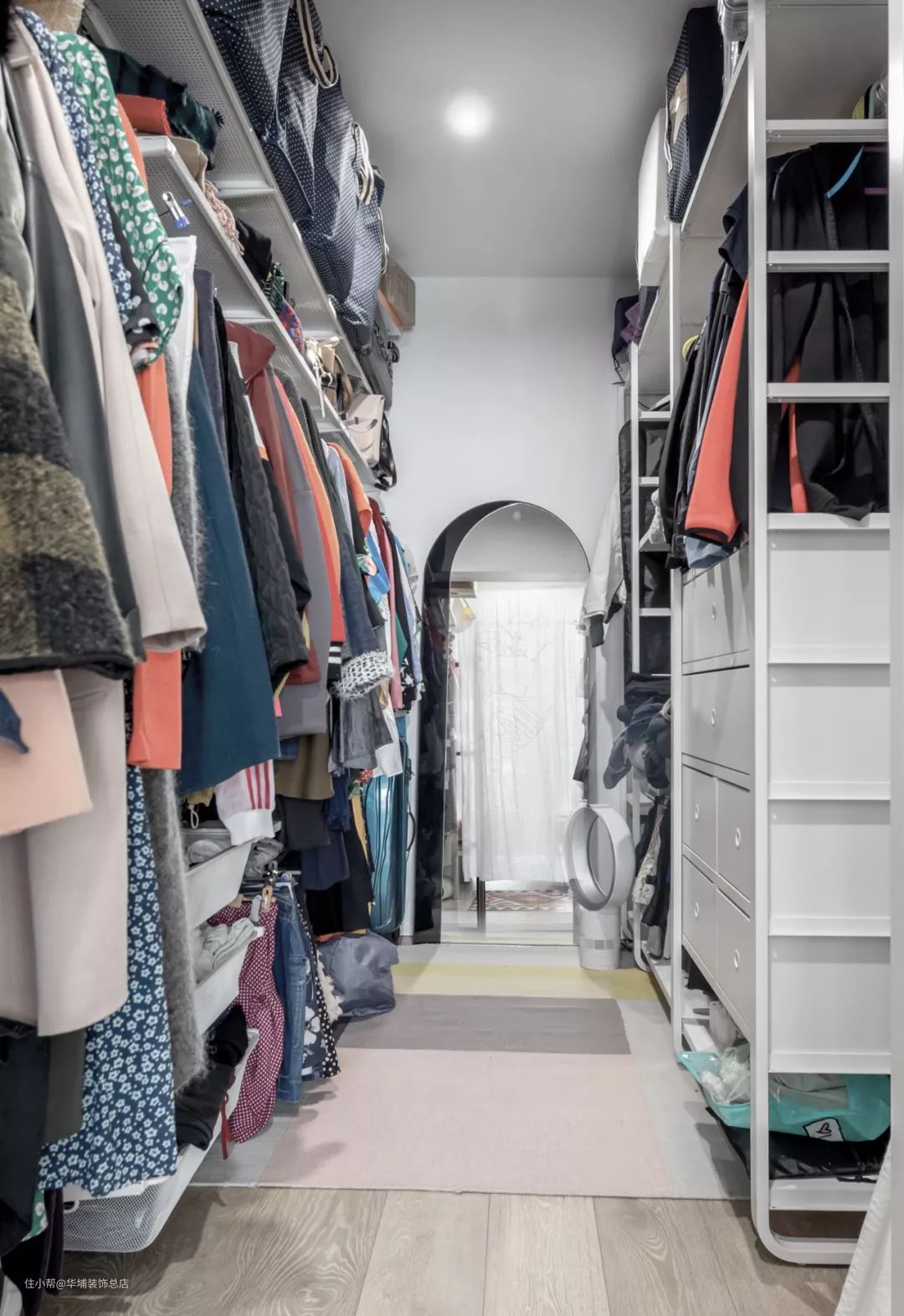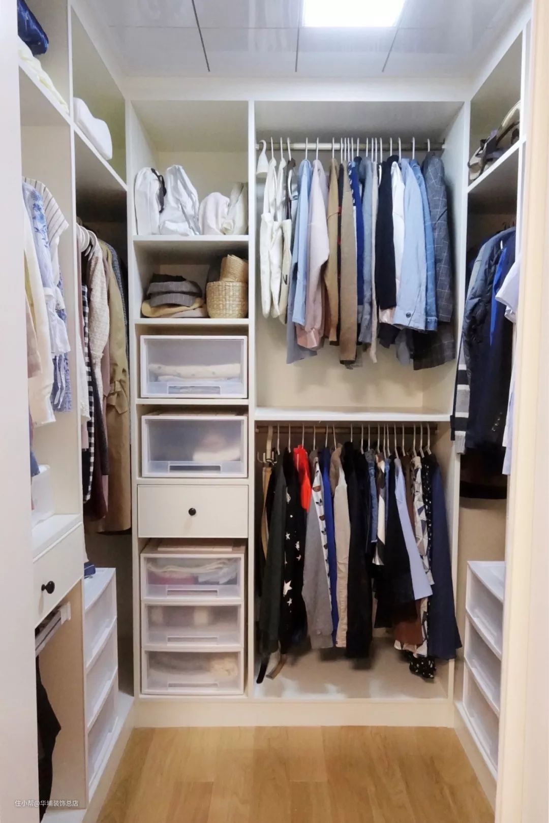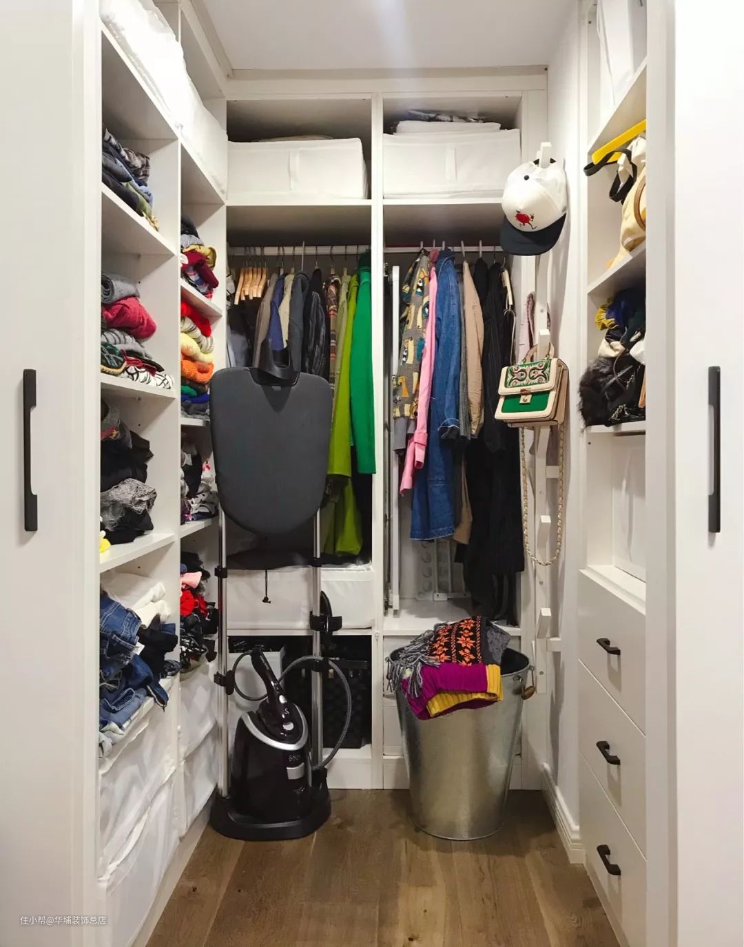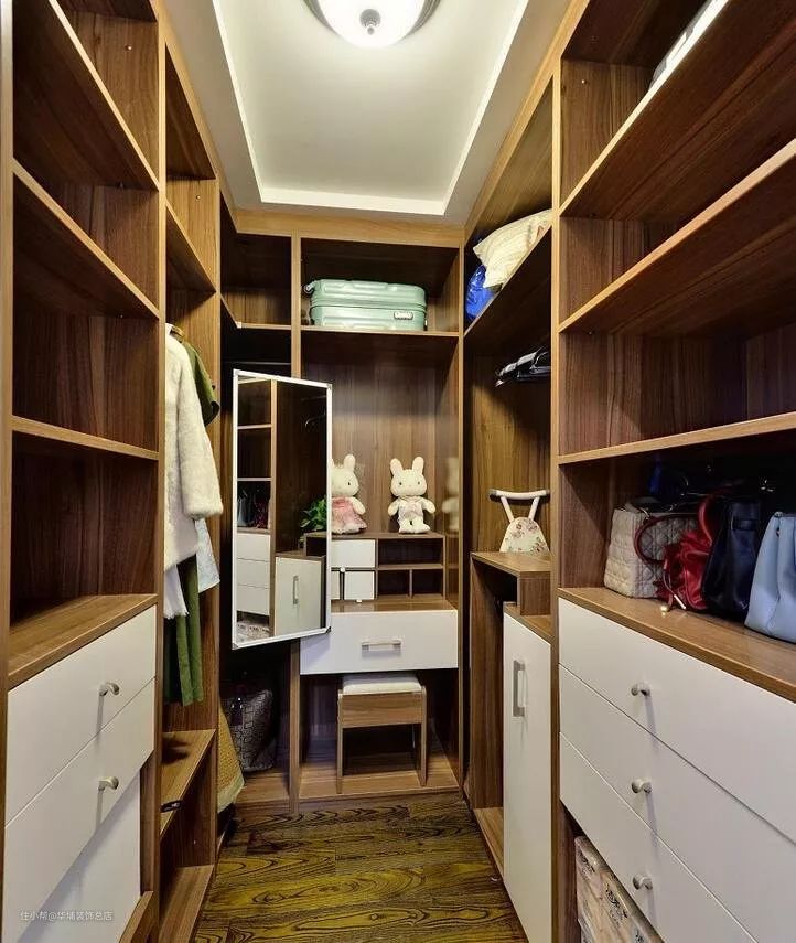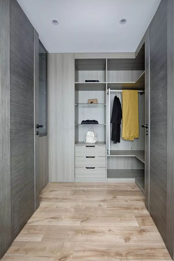 如果家里的灰尘不会太大的话,那么在设计衣帽间的时候,可以兼顾防尘与方便找衣物与取用,也可以装成带柜门+开放式衣帽架的组合,这样不常用的就收到带柜门的柜子,而常用的衣物就直接挂出来,这样的设计也是非常的实用。