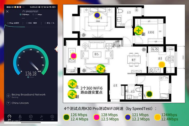 手机WiFi6也得脚踏实地的测试,下图可以看出我的360 双母WiFi6路由器布局方案,以及测速的4个位置,穿墙模式下覆盖全屋,多处测网速均没有明显衰减。