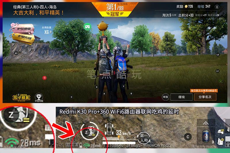 平时大家喜欢吃鸡吗?我周末偶尔遇到老同学开黑会打上几轮,可以看到Redmi K30 Pro在WiFi6下《和平精英》调到目前最高“超高清”+光影反射画质,延时最高也在30ms以内,和队友语音交流畅快,我家的网络也不会再拖后腿了。