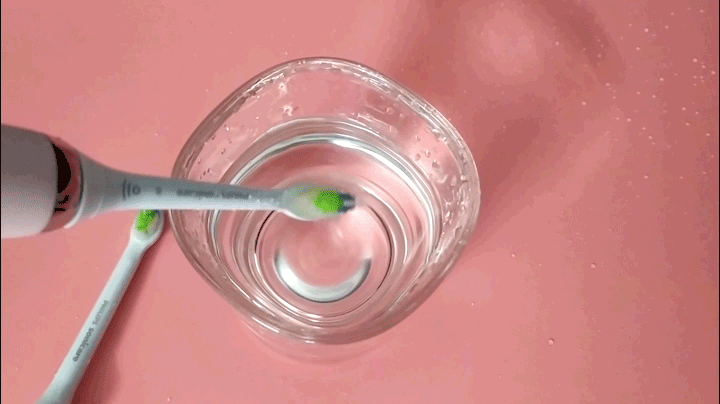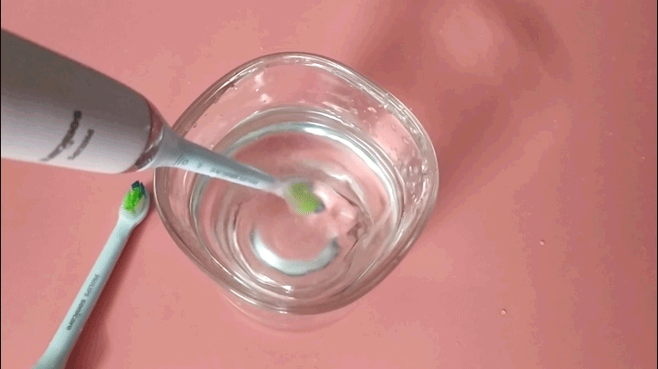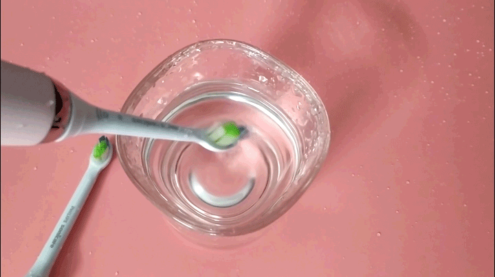 电动牙刷柄1个、牙刷头2个、充电器1个、玻璃充电杯1个以及充电旅行盒1个。东西很多,考虑到了居家和旅行的需求。在家就用玻璃充电杯,使用时当作盛水器,不用时与充电器搭配,玻璃杯的底部是凹形的,刚好可以与充电器契合,通电后,将刷柄放入其中,便可以完成充电。