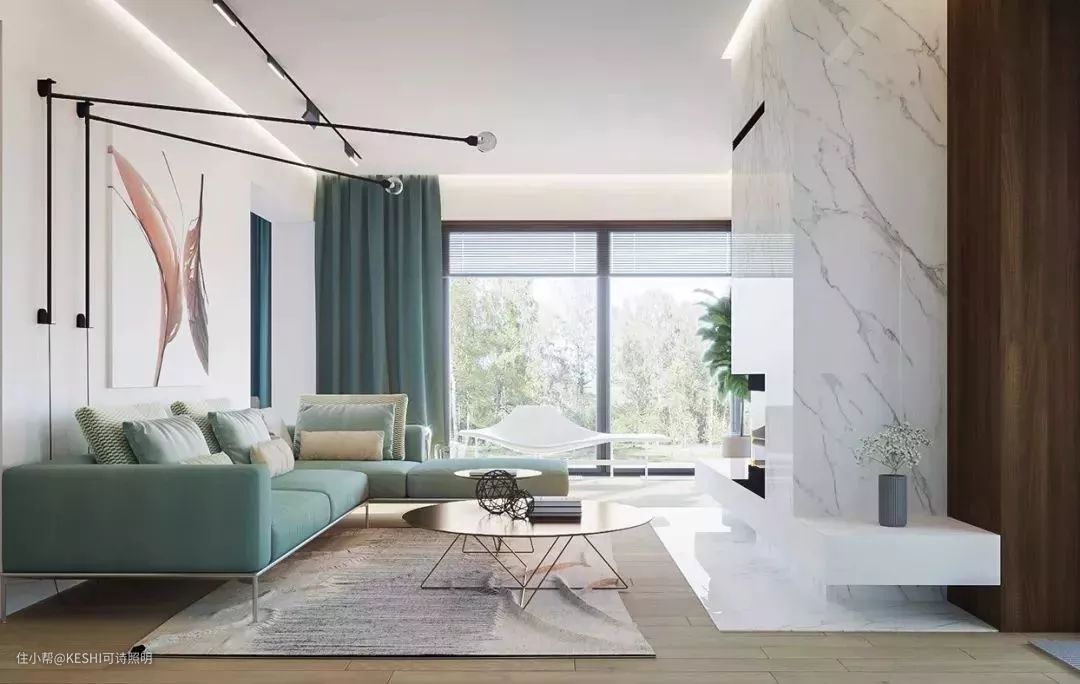 简单举例来讲,就是无主灯设计风格中,常用的轨道射灯,不一定就要按一个方向投射,也可以往墙面,也可以往地面等等不同的方向。