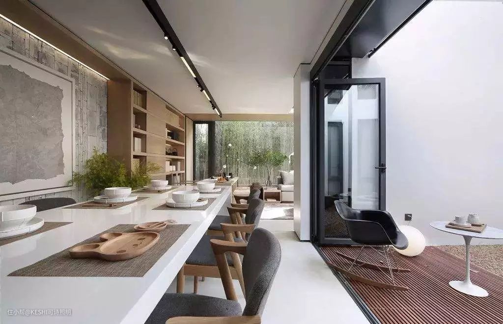 在室内设计中,往往运用在客餐厅中间的过道,可以设置磁吸轨道灯中和的光源,采用色温低或者亮度低的光源,能大幅度的提高人的视觉舒适度。