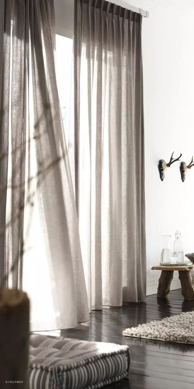 近年来由于北欧风格选的人多,很多人越来越喜欢亚麻材质的窗帘那种禅意和舒适感。亚麻窗帘布具有不规则的纹路,质感非常纯朴,同样也加入涤纶让帘子更加遮光和硬挺。