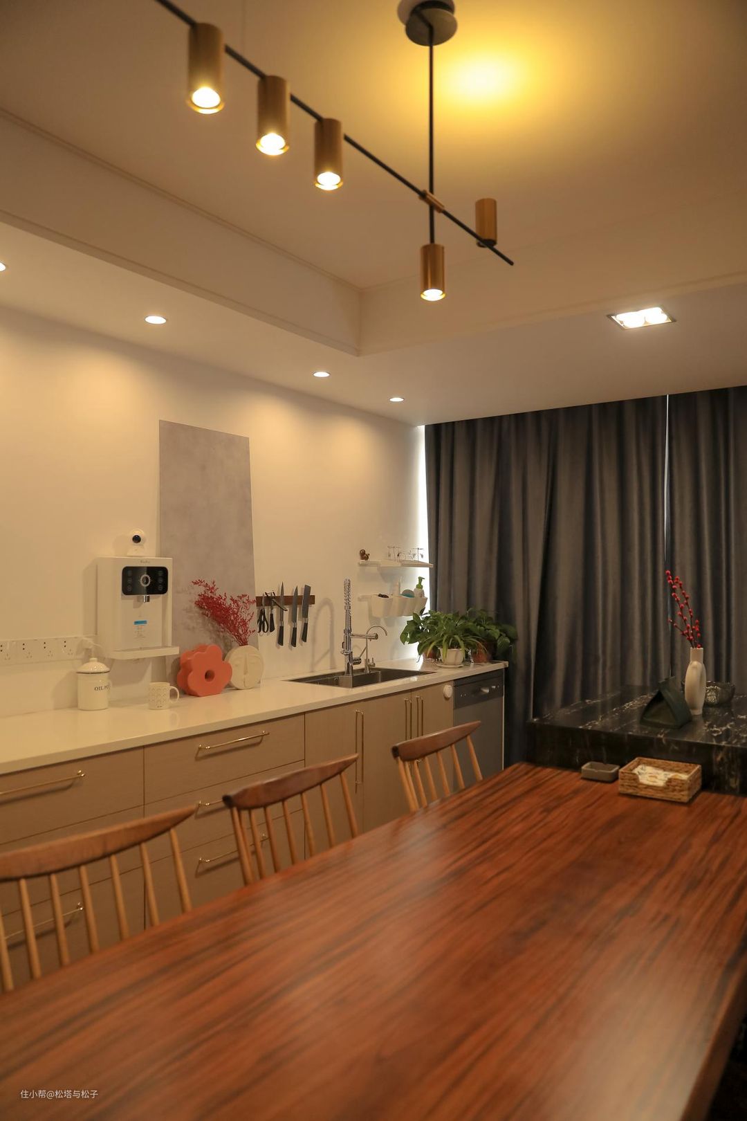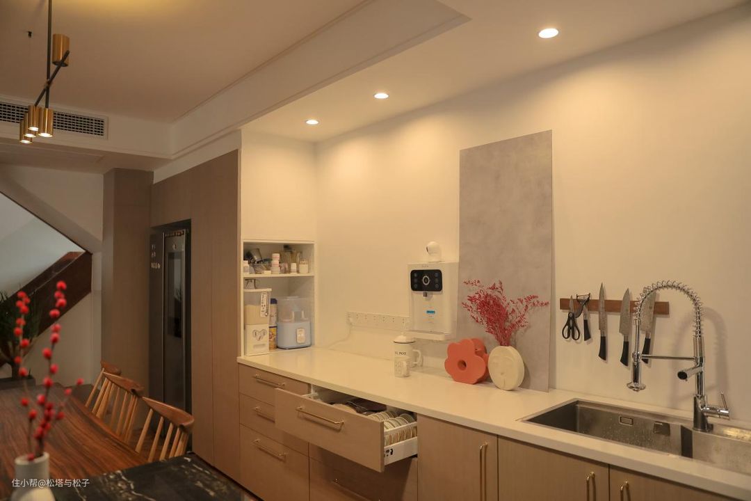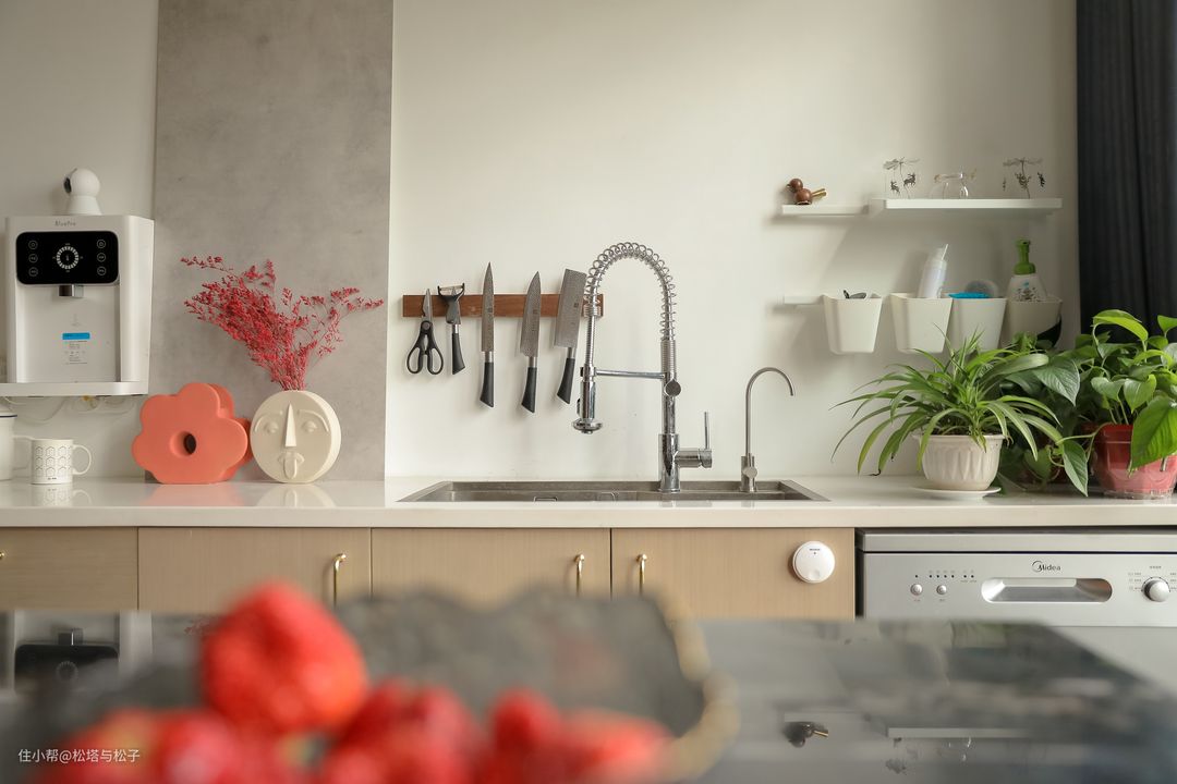 嵌入式射灯全屋其实只有两个,分别是西厨岛台和客厅正中心。想象着孩子长大后我会在两侧沙发的中央放上茶几,茶几上的饰物需要聚光灯的照射。岛台已经充分发挥了这个功能啦,花瓶、干花玻璃罐、果盘、牛皮抽纸盒、藤编餐巾纸盘依次登场,强光之下放啥都美。