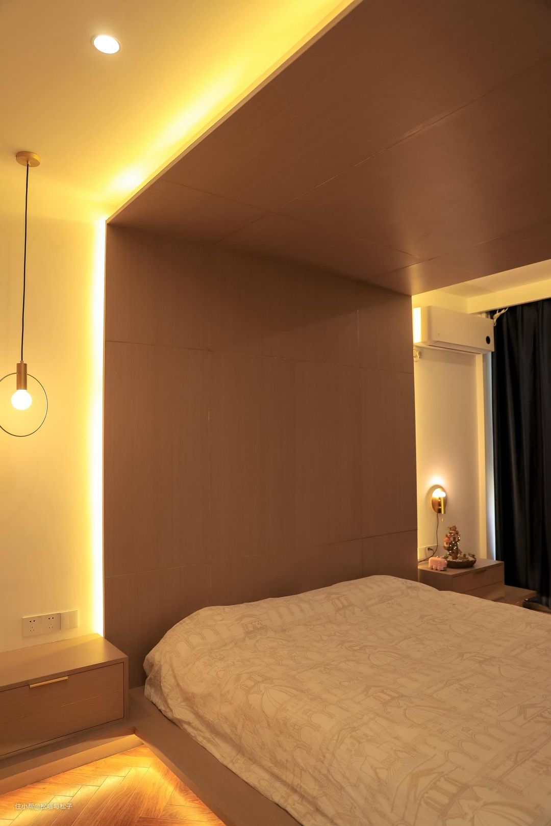 暖黄色的灯光顺着木饰面从床爬上墙壁再爬上天花,灯光引导着木饰面蔓延的方向。躺在床上经常有身在五星级酒店度假的错觉。