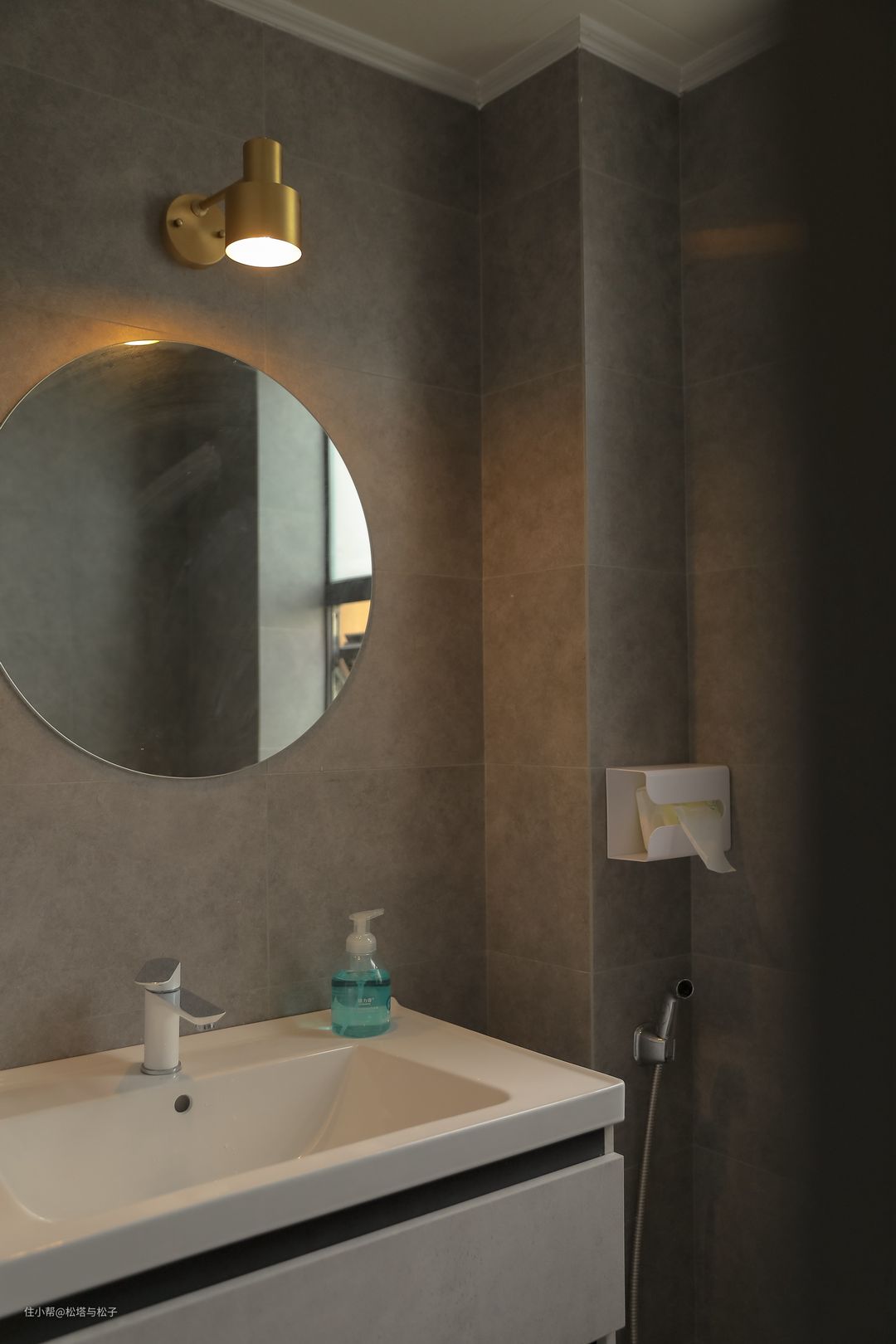 卫生间的圆镜上方是壁挂射灯,射灯和圆镜的搭配很显质感,灯具243元,灯有点小贵,圆镜65元,总体来说还是省钱又好看的!