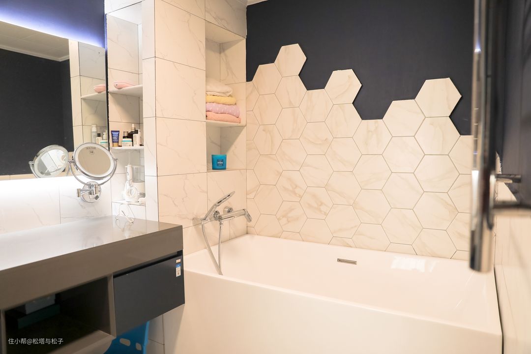 主卫长长的浴室镜上下各一根灯带,永远不要低估自己有多自恋,尤其是照镜子变得富有视觉美感的时候,冷白色温和浴室的白瓷砖相呼应,蓝色卫生间一贯是伙伴们夸奖的重点区域,浴室镜功不可没。