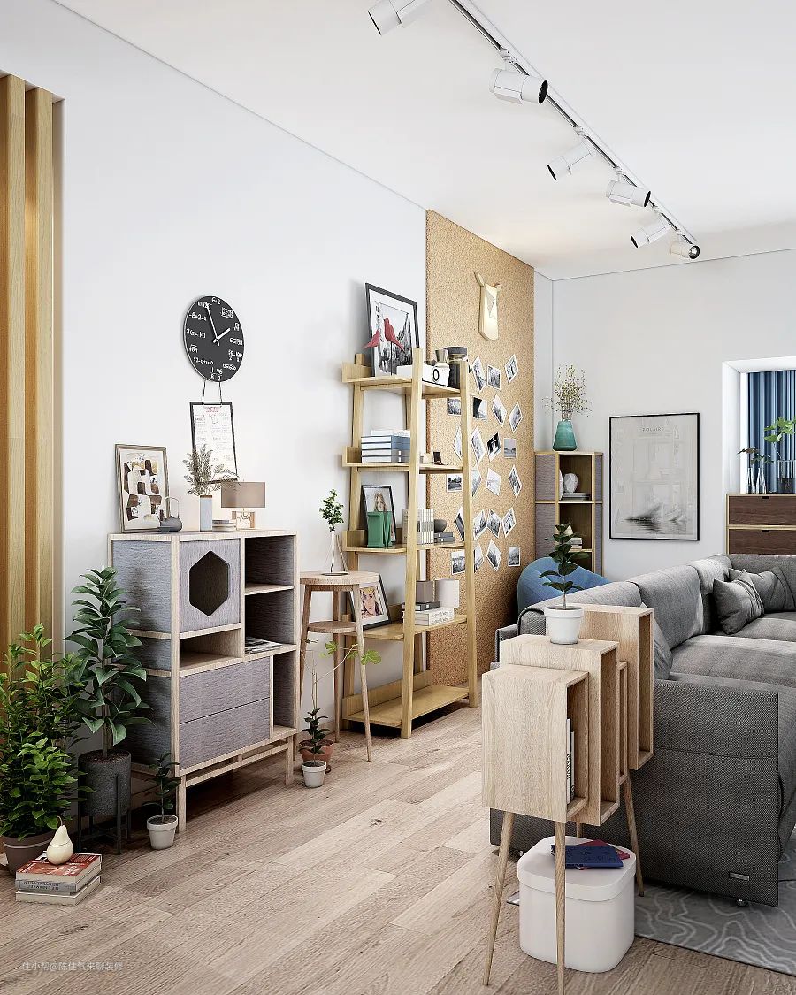 背景色:白色、浅灰色。基础软装配色:白色、浅色系(粉、绿)、棕色、原木、白色。
