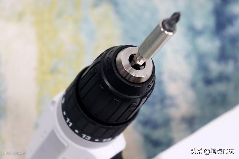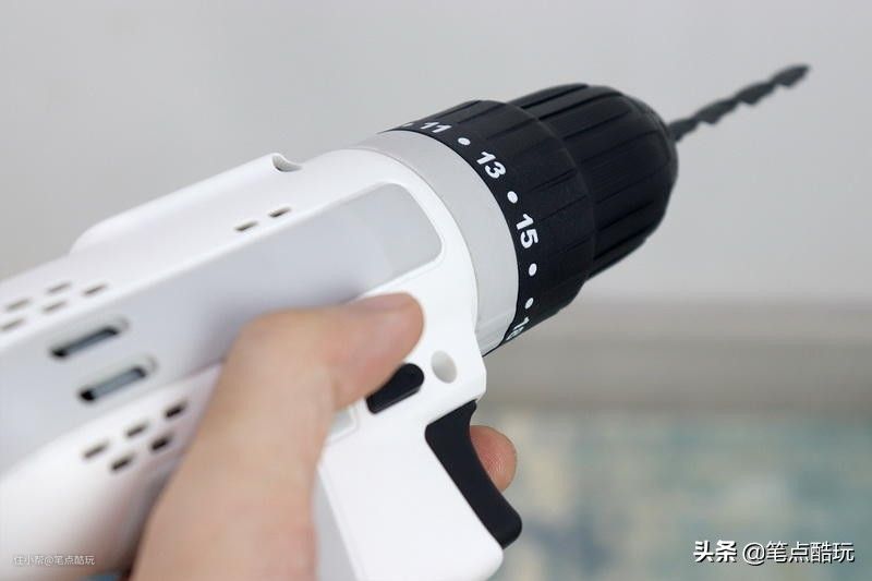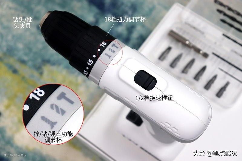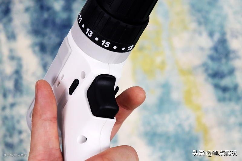 中看也得中用,玛斯工匠12V锂电冲击钻采用单套10mm夹头,配合主轴锁紧钻头或批头,比传统双套夹头更便利;切换螺丝批、电钻、冲击钻模式,也只需转动灰色的的调节杯,黑色18档调节杯是针对 螺丝批功能 的扭矩档位。
