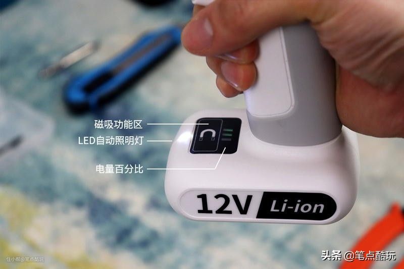 玛斯工匠12V锂电冲击钻采用的是一体式内置锂电,电池无法拆卸,因此无法使用备用电池随时替换增加续航时间,亏电时需要用原装充电器充电,插头在内置锂电池尾部;安置锂电的位置也是可以直立的冲击钻底座,且此处有磁吸区、3个LED电量指示灯,以及一枚高亮度LED工作照明灯。