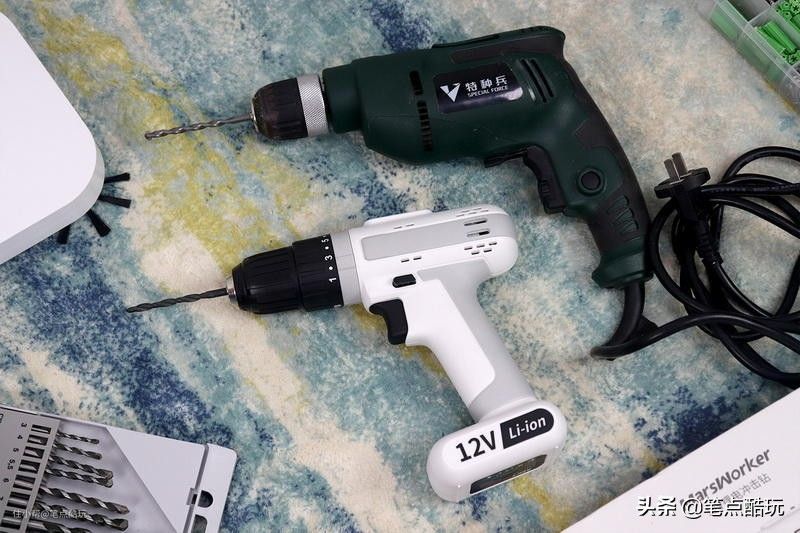 为啥我会推荐买无线电钻?看下图你就知道了。那个墨绿的杂牌手电钻我已经忍了三年,缺点很明显:必须接220V市电,拖着线缆很累赘,装个床头柜拧拧螺丝还行,踩梯子登高就各种麻烦。
