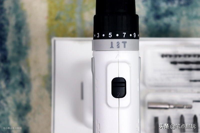 顶部的机械双档位转速推钮可以切换扭矩高低,1档位转速低,扭矩高,适合大负载场合,用于打孔力度更大;2档位正相反,适合低负载场合,转速更快,扭矩偏低,更适合松紧螺丝。