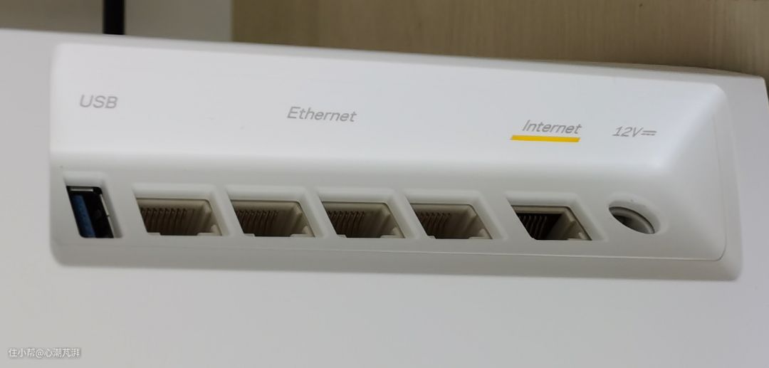 1个USB3.0接口,接个U盘或者移动硬盘上去可以当简易NAS,官方宣传是“轻松构建高速家庭私有云盘”;1个千兆WAN网口和4个千兆LAN网口,对于网线装在弱电箱,且通过墙壁埋线到各个房间的家庭来说,这种设计无疑是非常适合的。