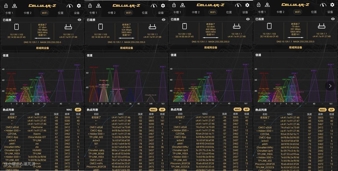 首先来看一下信号强度,对比原来的路由器以及其他可搜索到的信号,优势非常明显,在三个频段内都是非常有优势的,自动连接的是信号最好干扰最少的信道161。