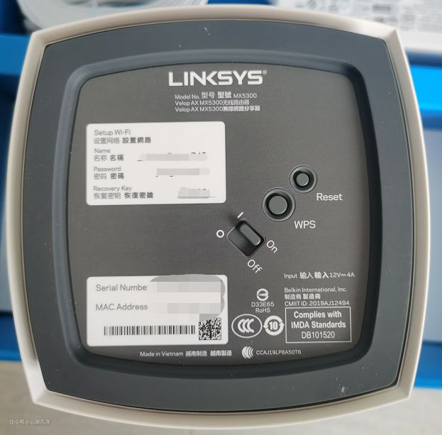 底部有一层橡胶防滑垫,标注了一些参数,如节点名称、密码(没错,初始设置也有密码)、恢复密码和型号、序列号、输入输出参数等,还有电源开关、WPS和Reset按键。