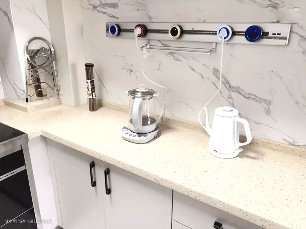 轨道插座:时尚美观。可以随意挪动,这样在使用电器的时候不需要动电器,只要把插座拿一下就可以了。轨道插座的数量充足,厨房的电器几乎都可以用到。使用方便,不占地方。