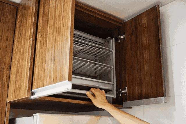 【吊柜】:吊柜一般分成两格,下格的东西要满足1.6米高的人很轻松地拿放。还要考虑高个(1.8米的男性)洗菜和切菜的时候,不要碰头。最佳尺寸为吊柜厚度一般在300-350mm,离地拔起1.6米的位置以上最佳,如果低于1.5米,不仅影响厨房操作空间,而且厨房会显得局促压抑。