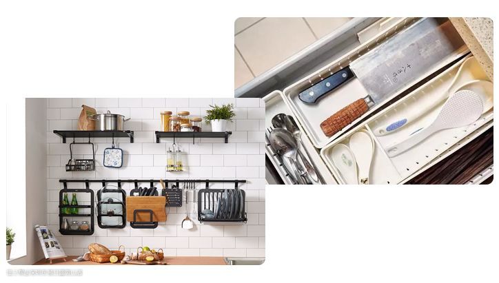 壁挂:实用又省地儿,锅盖、调料、菜板、铲子、碗碟……可以多种方式组合,想挂什么就挂什么。