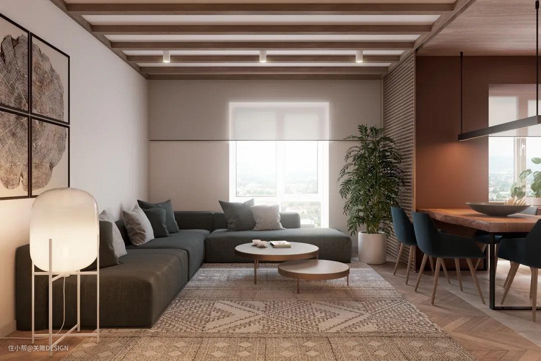 井字型吊顶,适合客厅并非方方正正的空间,或者在客厅中有横梁的空间,通过使用井字造型的纵深感,隐藏酱紫的户型的缺陷。可以减少因为户型缺陷带来的空间压迫感,让空间显得有格调,并且酱紫的吊顶与美工格特风搭配,也是有一种很独特的高档与自然和谐之美。