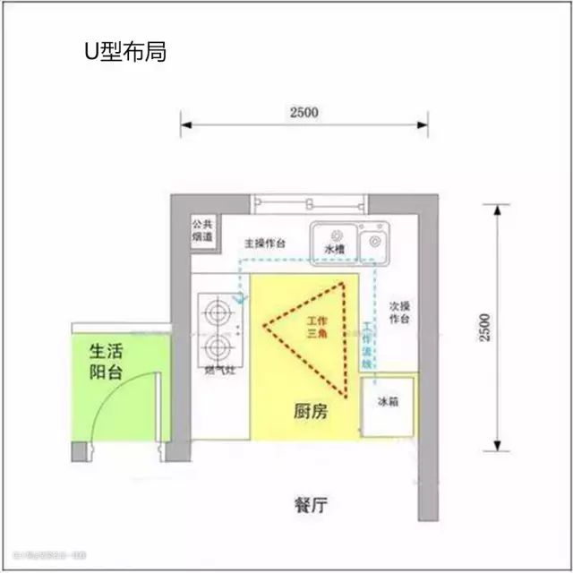 以上四种布局几乎可作为厨房“万能布局”而使用。当然,任何布局的初衷都是为了能有效利用厨房空间和提升我们的生活品质。举个合理利用空间的例子,我们有时也会同时使用“一字型”和“L型”两种布局,做成缺口“U型”。