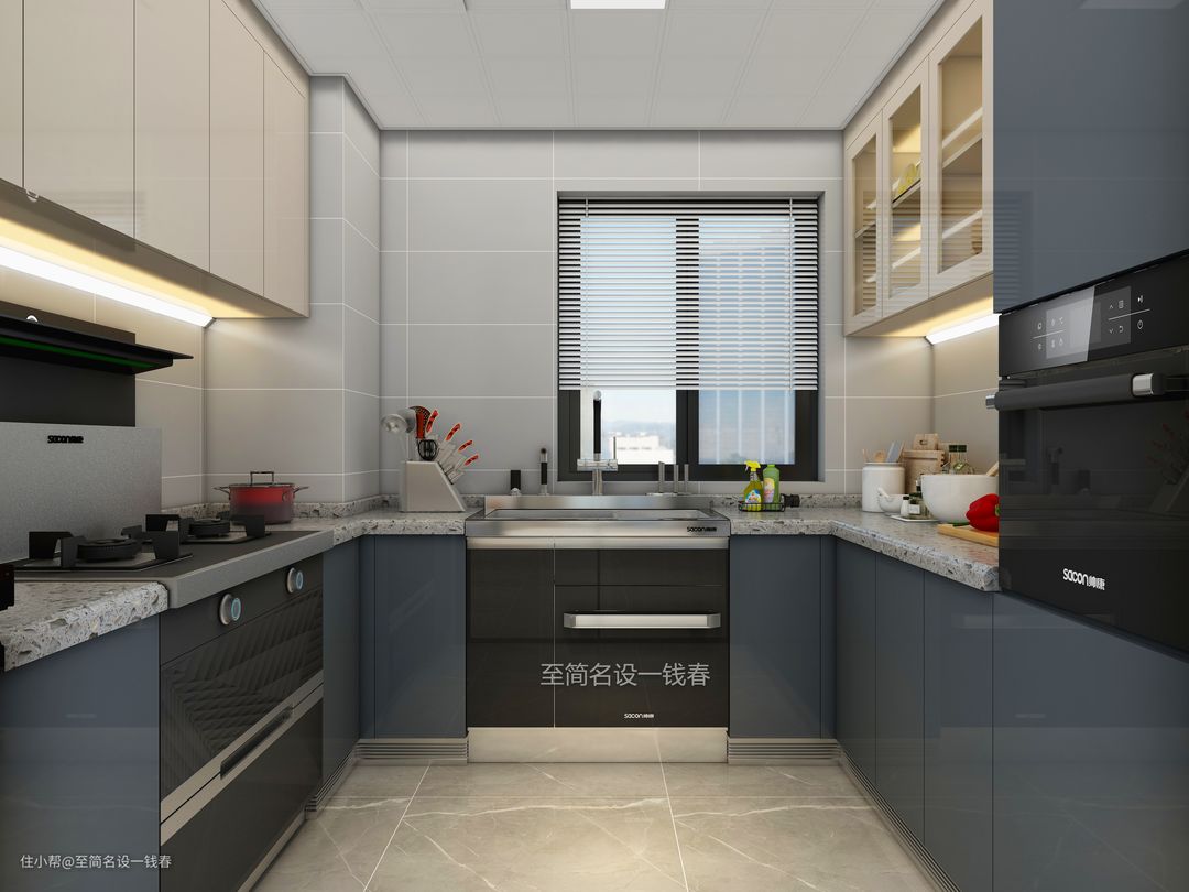 U型布局是在L型的基础上,增加了一个台面,适合空间较大且呈方形的厨房。这种布局可以将各区域功能划分的很明确,放置更多的厨房电器,容纳多人共同备餐。如果空间和条件允许,亦可在U型环区开口处添置中岛橱柜(或餐桌),做成开放式厨房。